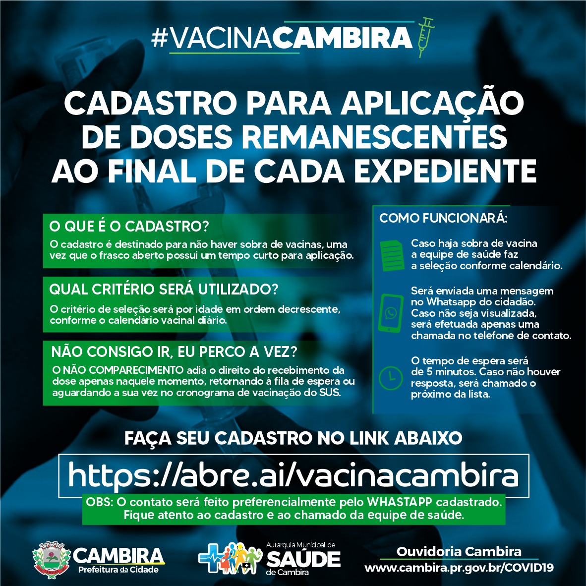 Cadastro para aplicação de doses remanescentes ao final de cada expediente #VacinaCambira (google.com)