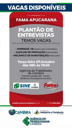 A empresa Mola Fama Indústria de Molas e Autopeças, instalada em Apucarana, estará em Cambira na próxima terça-feira (07/10) para a realização de um plantão de entrevistas de emprego. A ação acontecerá na Agência do Trabalhador, das 8h às 11h30.