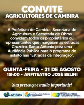 A Prefeitura de Cambira, por meio da Secretaria de Agricultura e da Secretaria de Obras, realizará nesta quinta-feira (21), às 15h, no anfiteatro José Belini, uma audiência pública voltada aos proprietários e representantes de áreas localizadas ao longo das estradas Cruzeiro e Santo Antônio.