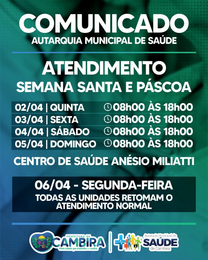 A Autarquia Municipal de Saúde de Cambira divulgou o cronograma de atendimento durante o período da Semana Santa e Páscoa. Conforme o comunicado, o Centro de Saúde Anésio Miliatti funcionará em horário especial entre os dias 2 e 5 de abril, das 8h às 18h, garantindo assistência à população mesmo durante o feriado prolongado.